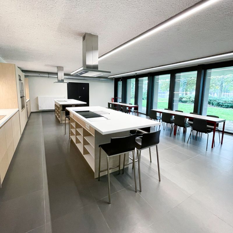 Deze volledig uitgeruste leskeuken van 78 m² is de ideale setting voor culinaire workshops, teambuildings of opleidingen. Met twee ruime keukeneilanden en voldoende werkplekken biedt de ruimte zowel functionaliteit als inspiratie. Het uitzicht op de vijvers creëert een rustige sfeer die creativiteit en samenwerking stimuleert. De leskeuken kan daarnaast gecombineerd worden met zaal ZILVER voor extra capaciteit of een uitgebreid programma.